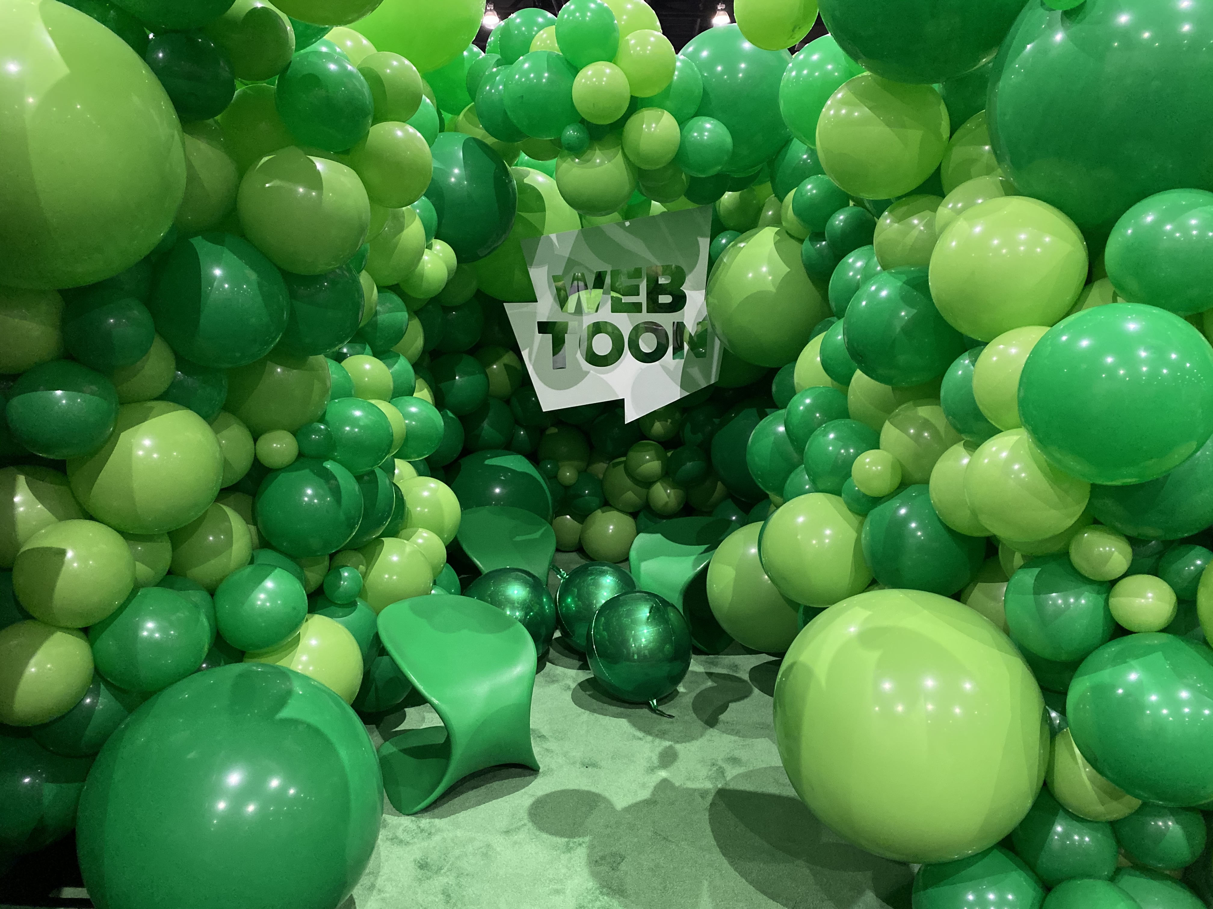 Pulling in big impressions and a strong foundation, Webtoon committed to a 2 year 3 – 4 market program. The Webtoon team kicked off the program with several boxes to check. The layout would need to allow for a larger shoppable merchandise area with storage, a PR space, a VIC “Very Important Creator” lounge, a real time user platform kiosk, a creator/artist meet and greet signing area, accessible in booth hidden storage space, a “bonus” post-it drawing wall, and 2 unique experiential spaces that captured measurable quantifiable data about their attendees. With so many goals in mind, it was clear to me that Webtoon’s booth had to be sustainable and adaptable to new initiatives, growing fandom and show to show rules and regulations throughout the US markets and convention centers. It was super important to map out the booth flow and fully understand the day to day activities. Comic Con booth traffic flow and aisle safety was huge challenge with so many engagements happening at once in and around the booth, (People herding might be the most strategic chaotic dance ‘live’ event producers tackle). This “smart” layout required stanchions, gaff tape, booth security and crowd controllers with the assistance of a strong show management relationship and forgiveness to ensure aisles would remain clear. The idea of an immersive digital photo booth space along with an immersive balloon insta-grammable room would provide more information on impression data and movement of attendees in the booth space. Both spaces captured social sharing capabilities, SMS and email collection with impression data analytics. Additionally, real time participant head counts of giveaway items, artist signings and merch sold all would help provide some quantifiable data Webtoon needed.
