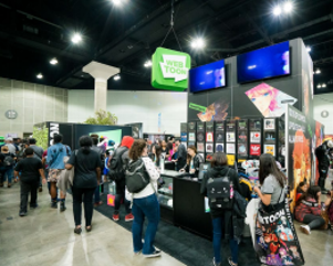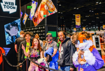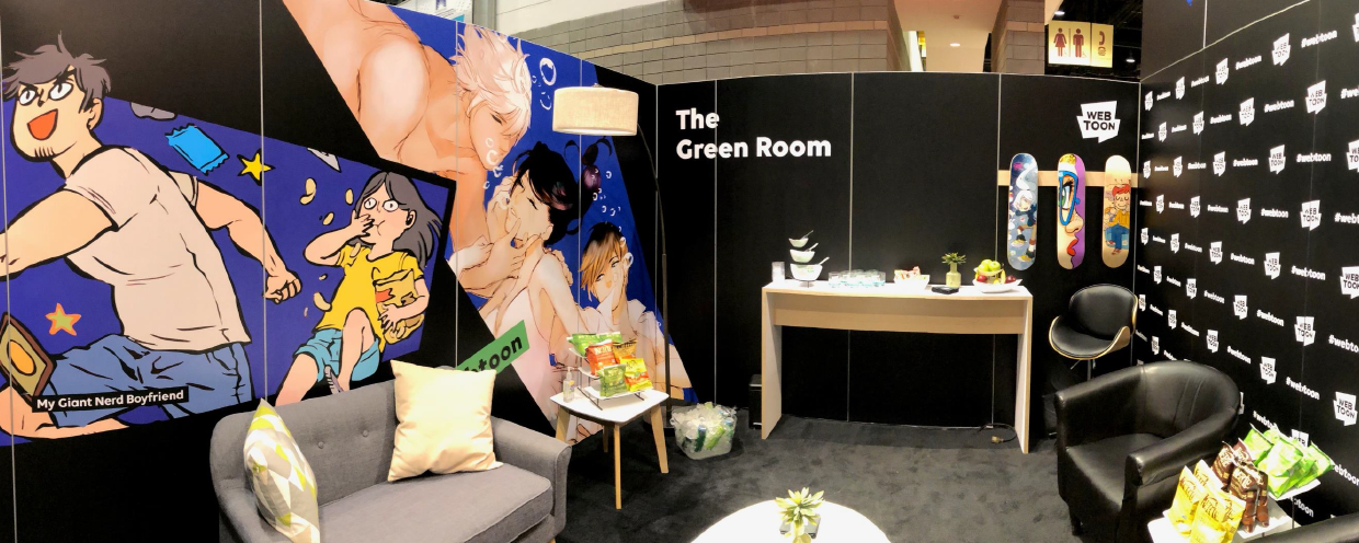 The culminated 30’x40′ island footprint fulfilled all of Webtoon’s requests. Brand ambassadors assisted with all booth activities, crowd control/booth flow in, out and around the booth, premium/collateral distribution and hyping up Webtoon. A larger in-booth storage closet behind the merchandise area, and a storage closet attached to the lounge room allowed for quick accessibility of colleterial, A/V equipment and personal belonging. Now we had functional spaces, sales opportunities, shared experiences, long lasting memories and great examples of KPIs.